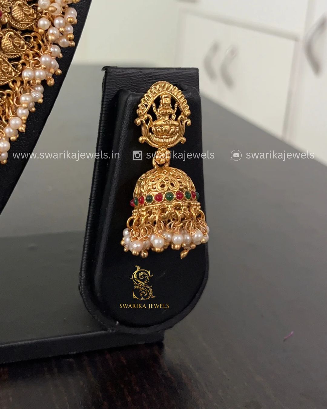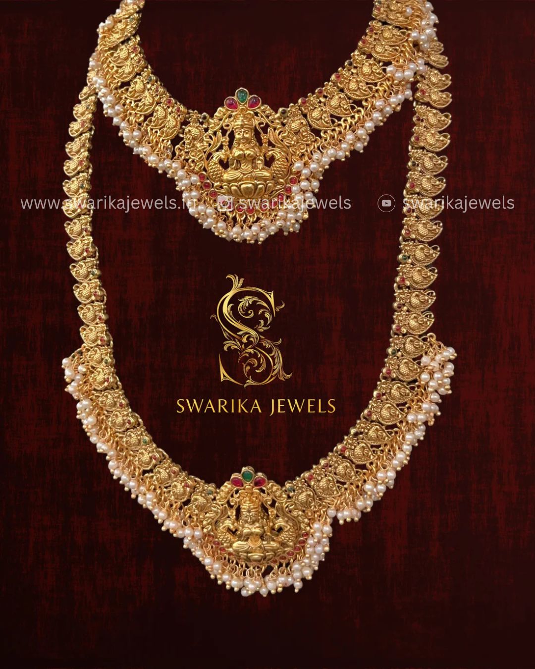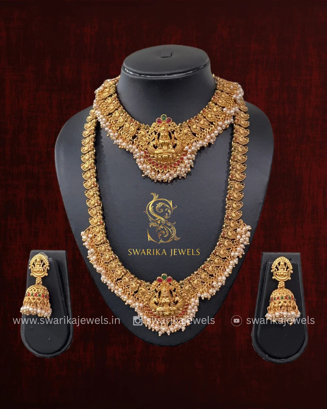 Step into your special day with unparalleled majesty with our Bridal Temple Haram Set. This exquisite South Indian bridal jewelry collection is meticulously crafted to make you feel like royalty. The set includes a magnificent long haram, a perfectly complementing short haram, and two intricately designed matching earrings – all imbued with the divine artistry of traditional temple jewelry. A true heirloom piece, it promises to complete your bridal look with timeless grace and auspicious charm.