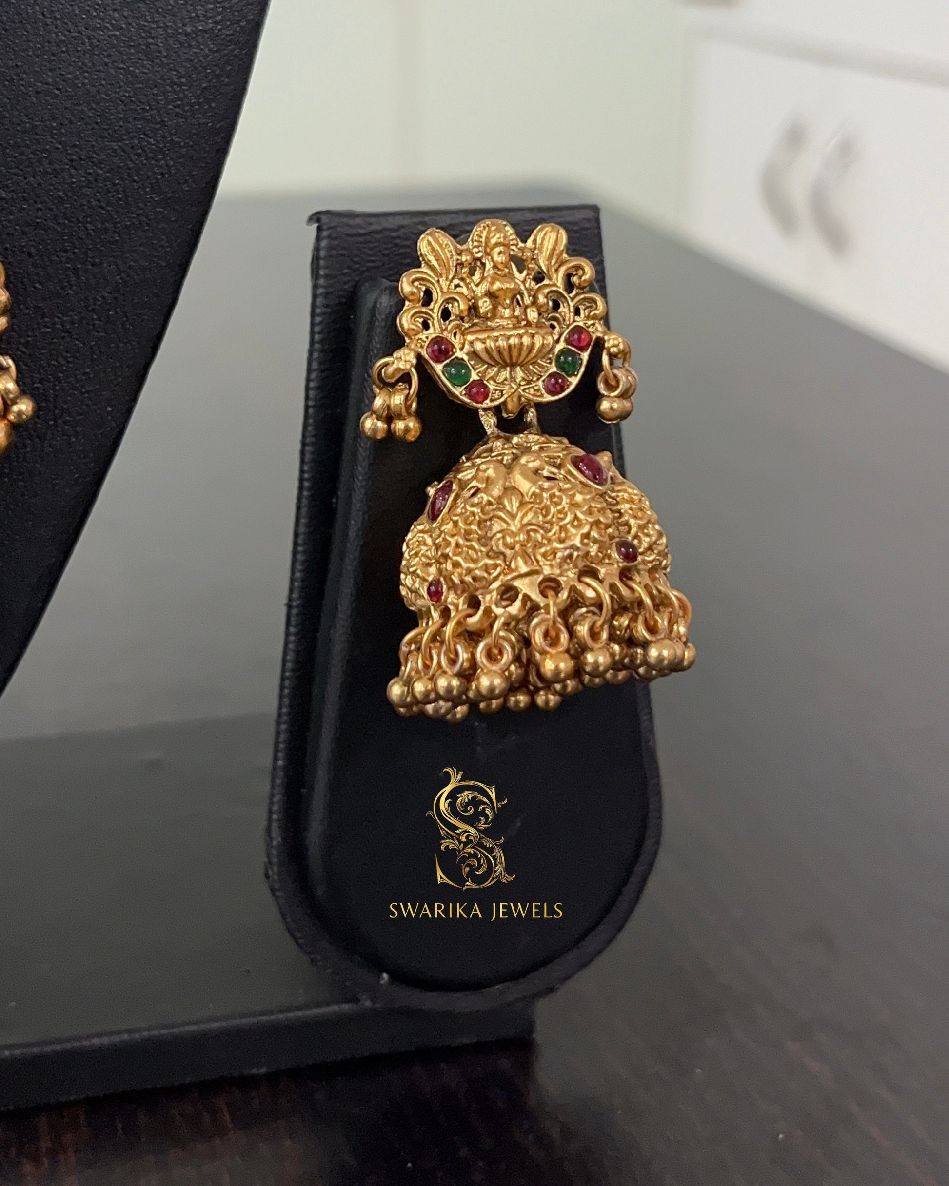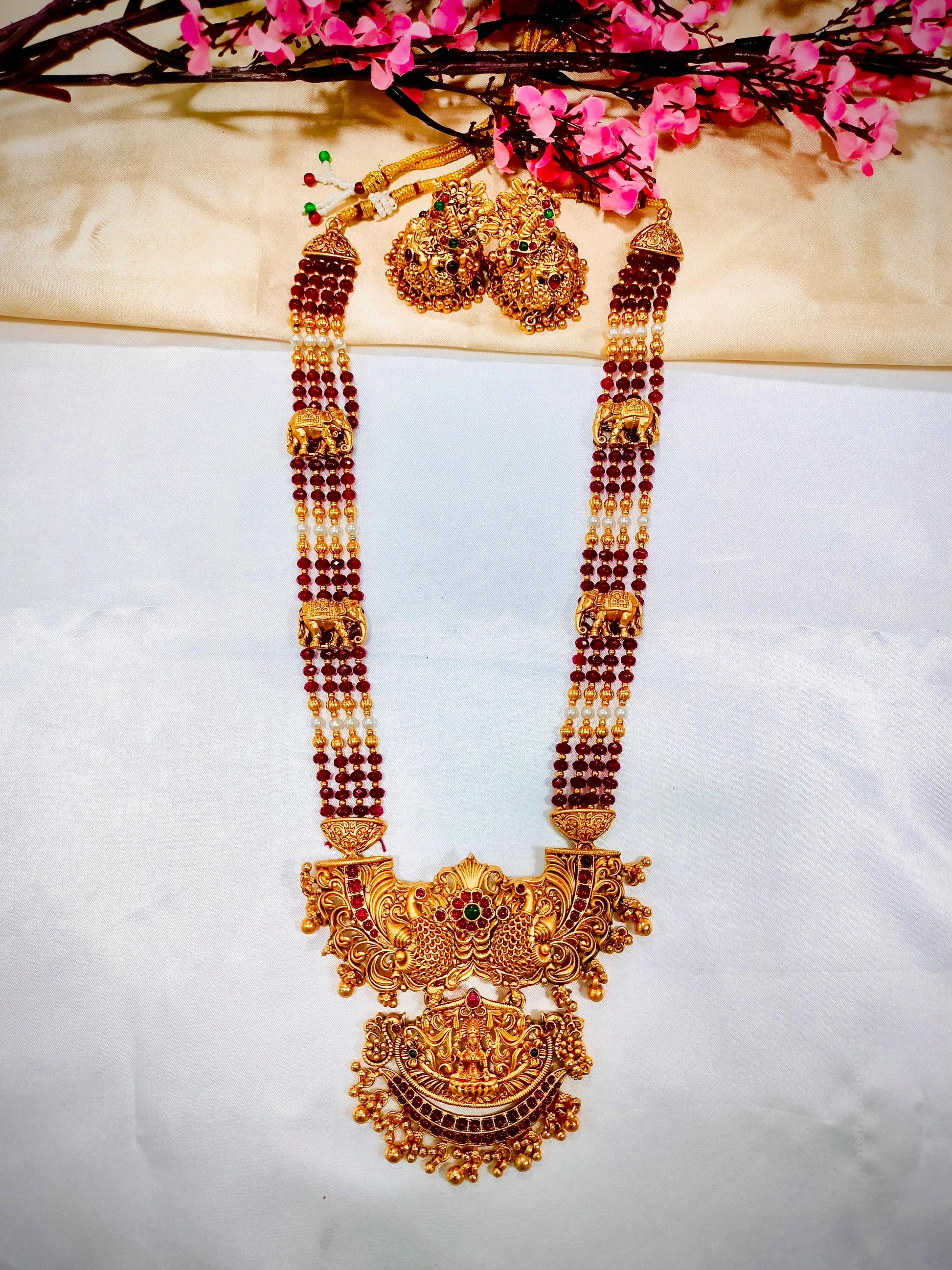 Embrace the epitome of traditional splendor with our Lakshmi Large Haram Set. Categorized under "Haram," this magnificent long necklace features an elaborate design adorned with the revered Goddess Lakshmi, symbolizing prosperity and fortune. Complete with two exquisite matching earrings, this set is crafted to make a truly grand and divine statement for any auspicious occasion.